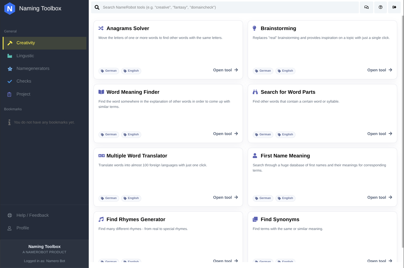 The Creativity area is focused on idea generation and creative exploration. These tools help you discover new directions, play with associations, experiment with word combinations, and produce fresh naming input when you are still looking for inspiration.