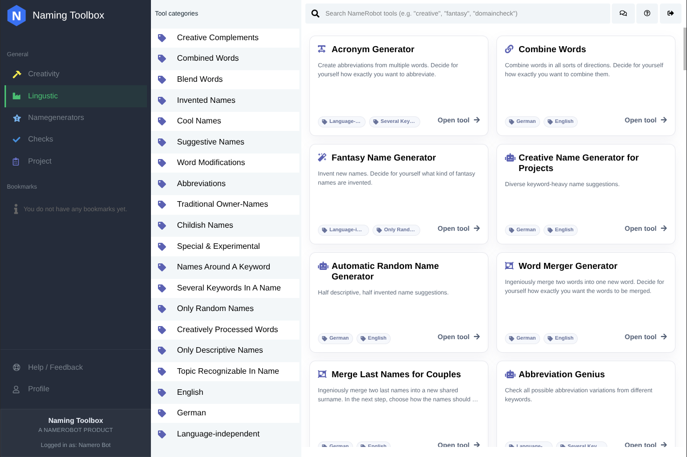 The Linguistic area helps you work with language in a more analytical and structured way. Here you can explore meanings, synonyms, rhymes, and other word relationships that can improve the quality, tone, and depth of your naming ideas.