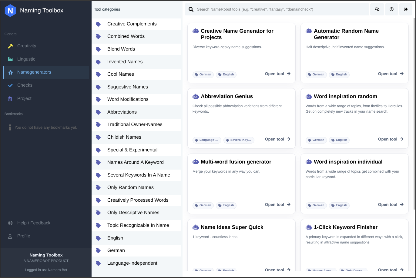 Together, these dashboard areas support the full naming process, from creative exploration and language research to name generation, validation, and organization.